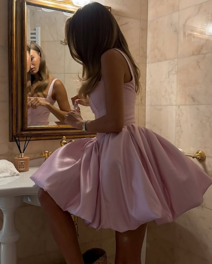 Simple A Line Spaghetti Strap Pink Satin Short Homecoming Dress Cocktail Dress HZ1023