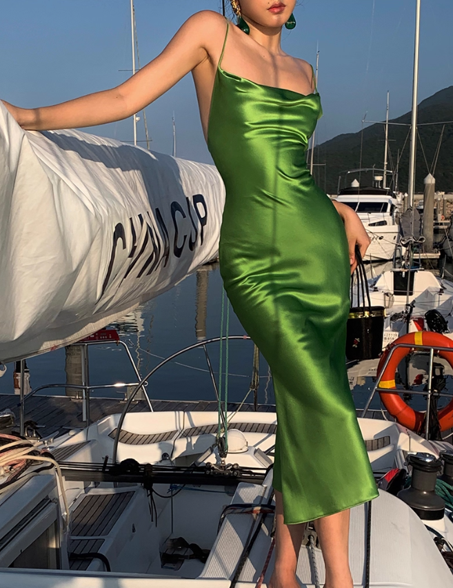 Simple Green Sheath Spaghetti Strap Satin Open Back Prom Dress Party Dress HZ1023