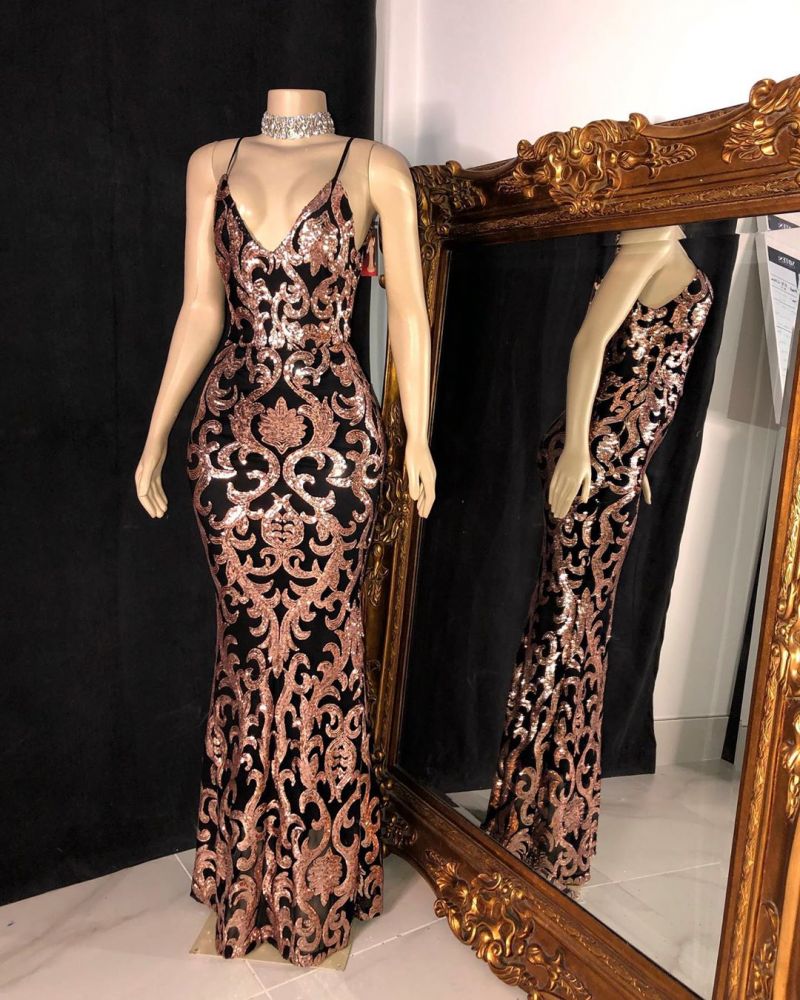 TRENDY SEQUINS APPLIQUES V-NECK SPAGHETTI LONG MERMAID PROM GOWNS HZ1023