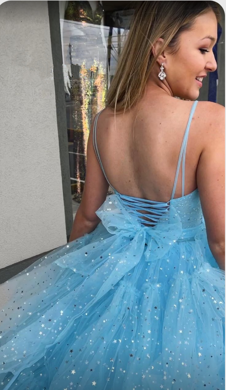 Unique Spaghetti Strap Blue Layered Tulle Sequined Hi-Lo Prom Dress HZ1023