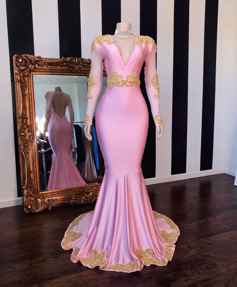 V-NECK LONG SLEEVESS OPEN BACK PINK MERMAID APPLIQUES PROM GOWNS HZ1023