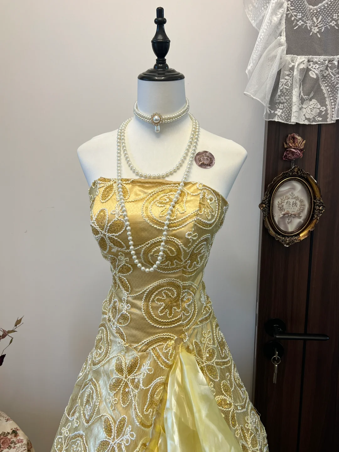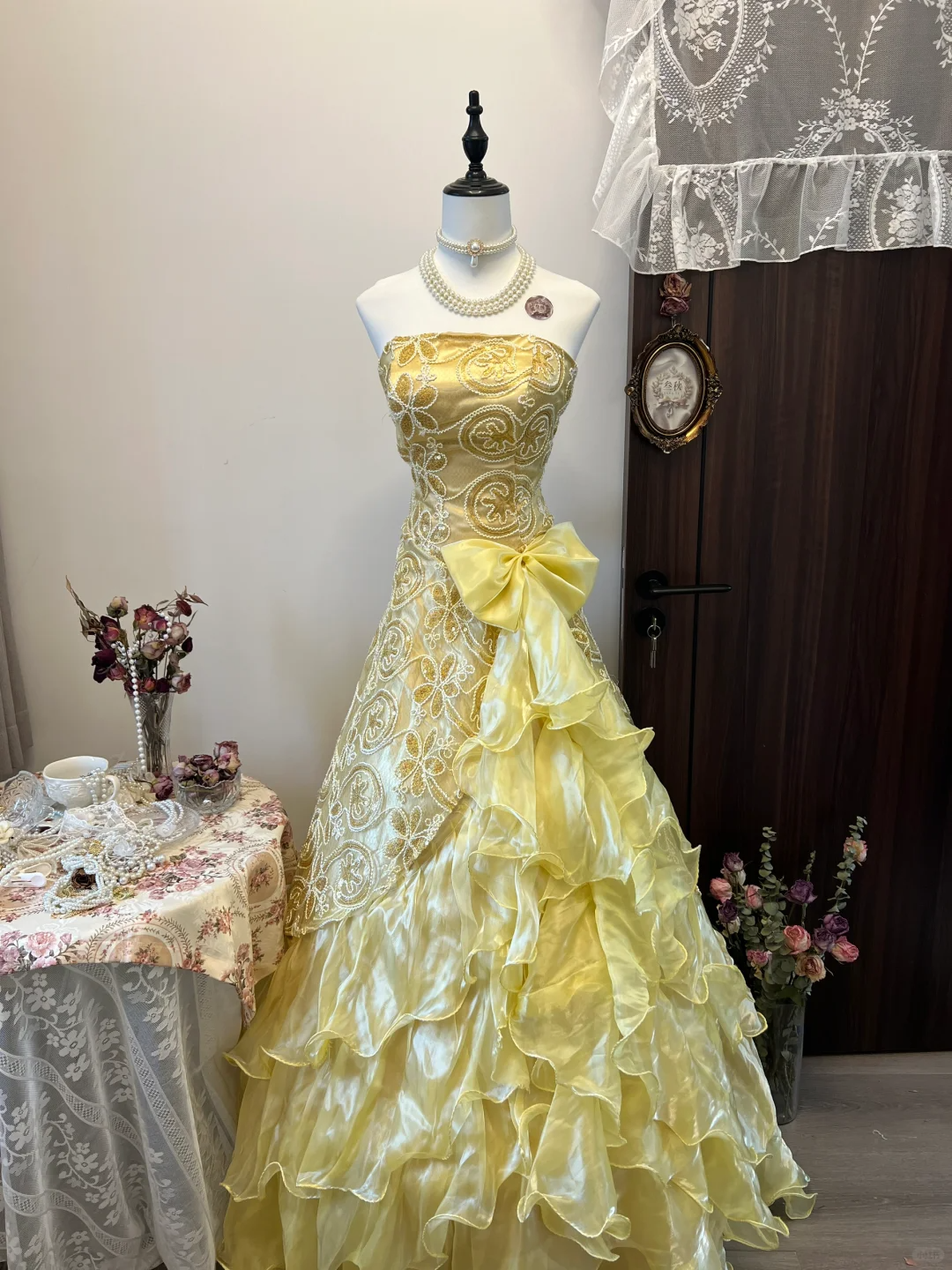 Vintage A Line Strapless Appliques Yellow Satin Organza Prom Dress Evening Dress HZ1023