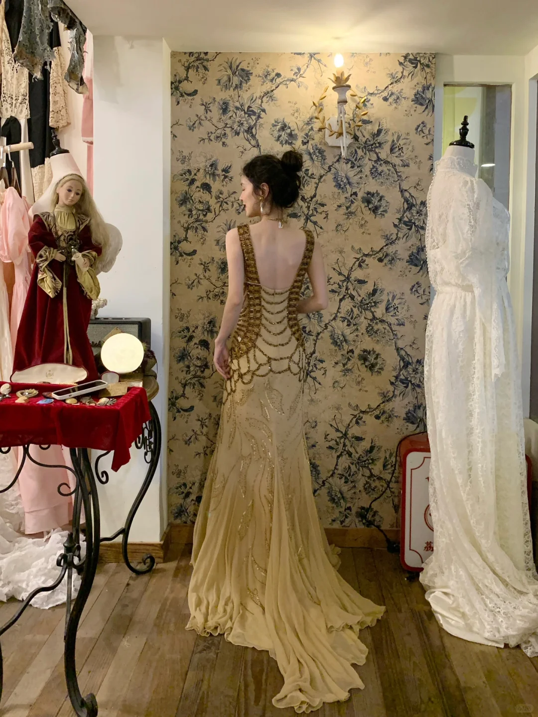 Vintage Exquisite Mermaid Straps Beaded Chiffon Prom Dress Wedding Guest Dress HZ1023