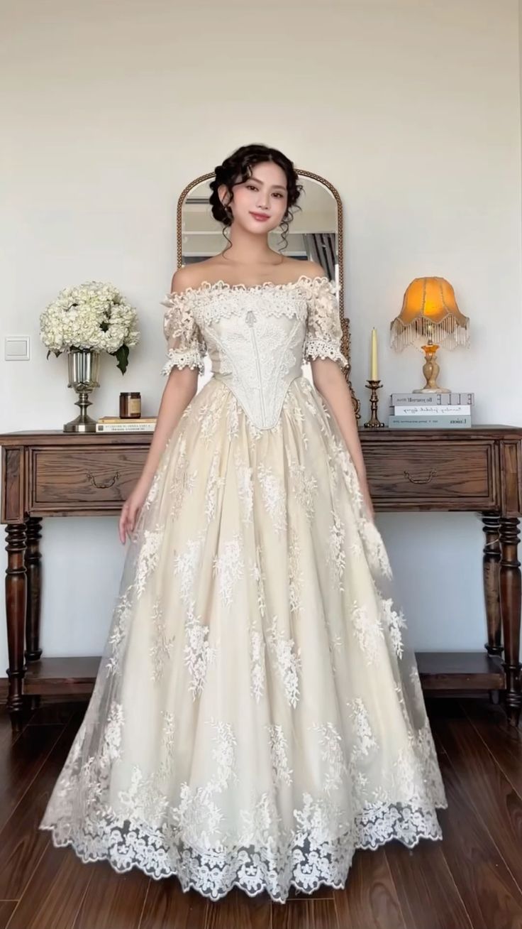 Vintage Ivory A Line Off the Shoulder Lace Satin Tulle Prom Dress Wedding Dress HZ1023