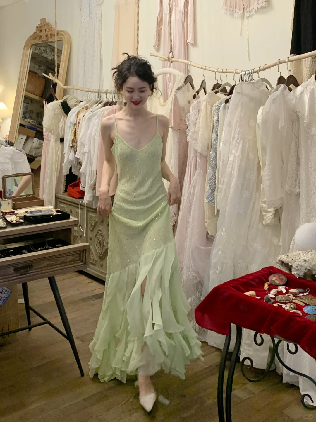 Vintage Light Green Mermaid Spaghetti Strap Beaded Ruffle Chiffon Prom Dress 16th Birthday Dress HZ1023