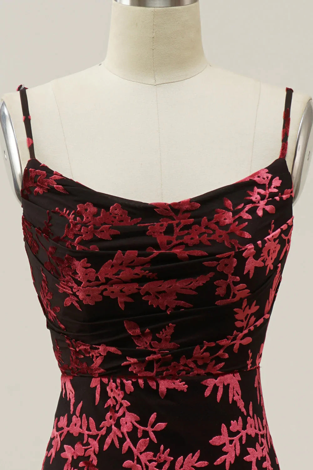 Vintage Mermaid Spaghetti Straps Burgundy Printed Velvet Long Prom Dress with Slit HZ1023