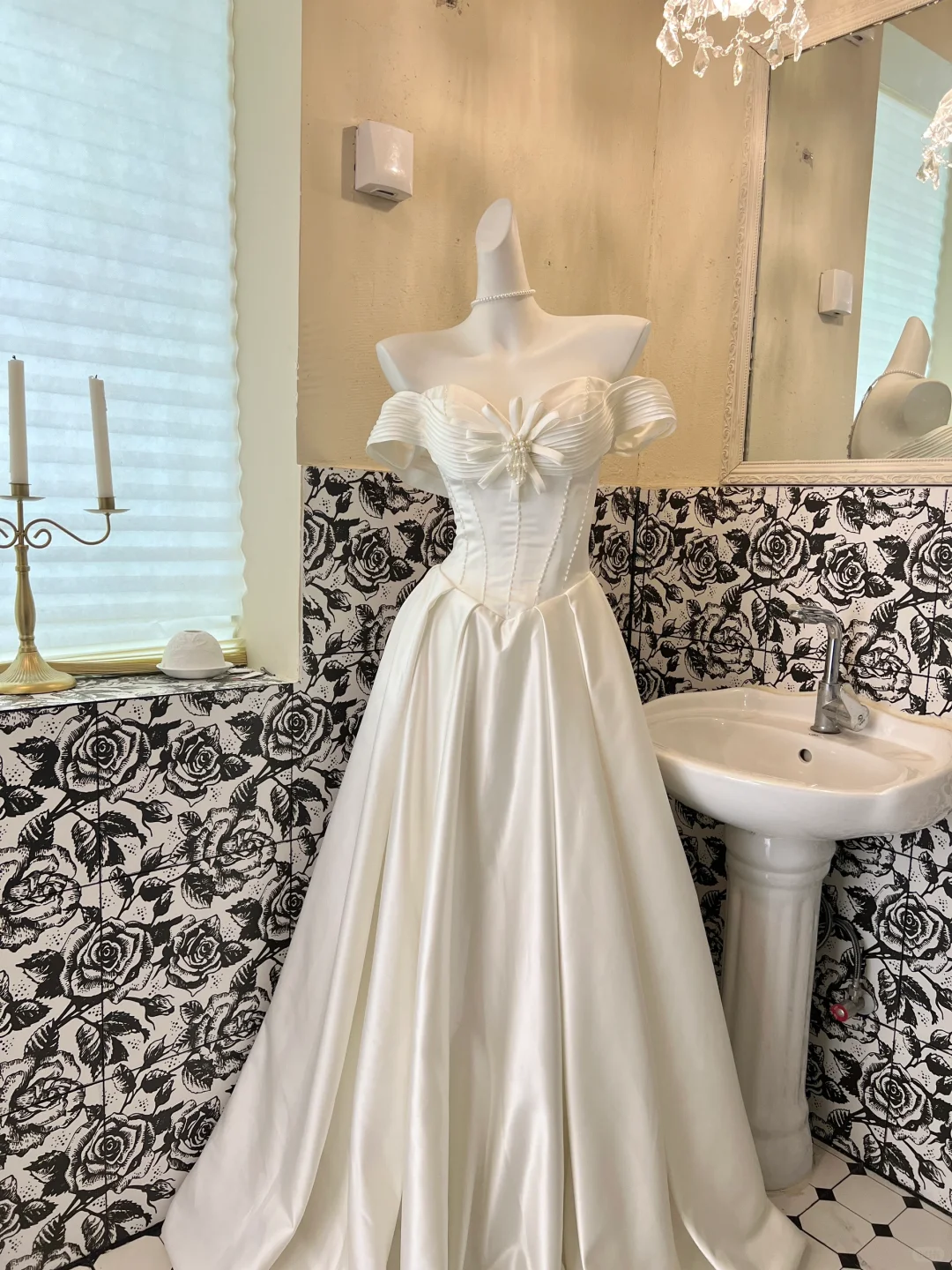 White Classy Ball Gown Off the Shoulder Pearl Satin Long Prom Dress Wedding Dress HZ1023