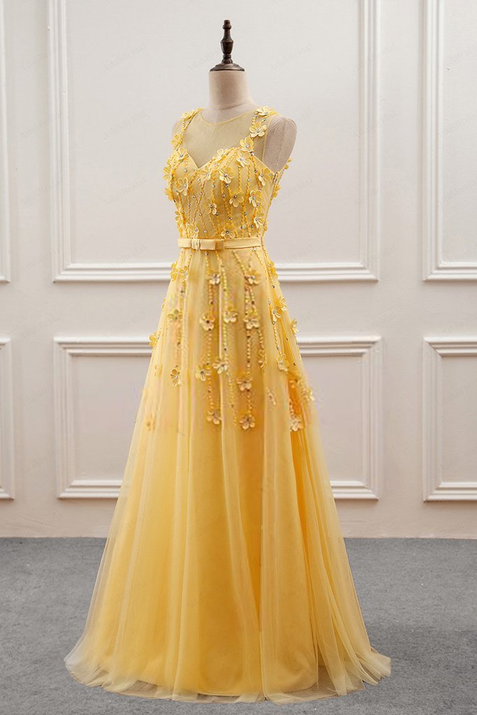 Yellow Flowers Tulle Long New Prom Dress, A-line Party Dress HZ1023