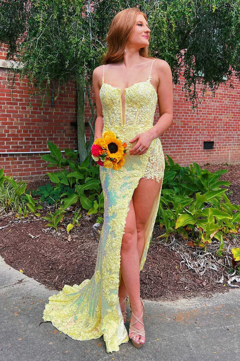 Yellow Sheath V-neck Appliques Sequins Prom Dress With Slit HZ1023