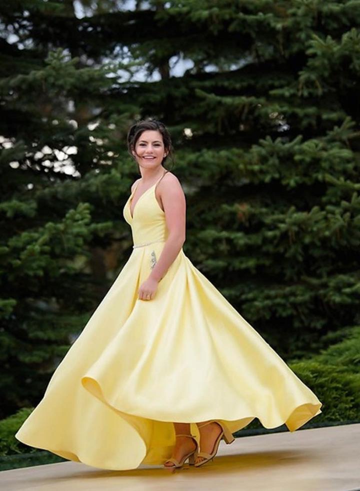 Yellow v neck satin long prom dress, simple evening dress HZ1023