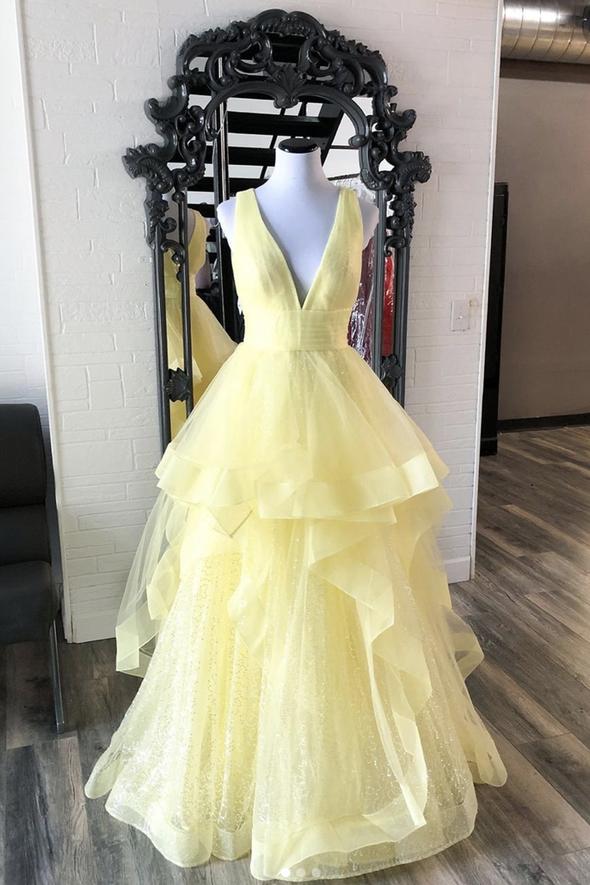 Yellow v neck tulle long A line prom dress evening dress HZ1023